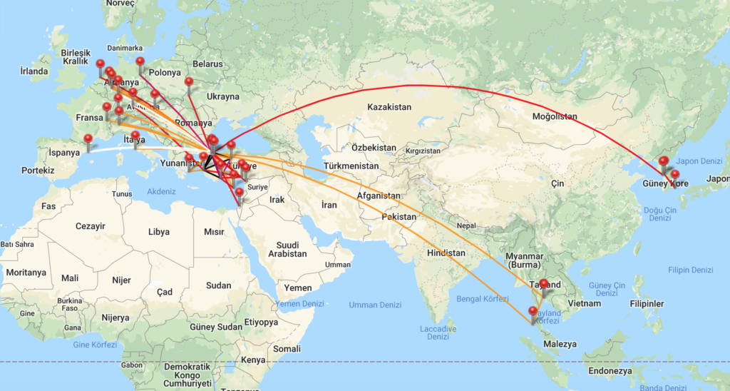 İlk yazılarda yeterince zengin bir paylaşım olmasa da uzun vadede tüm gezileri kendi çektiğim fotoğraflarla da besleyip; yazarak anlattıklarımı görsellerle de sunmayı hedefliyorum. Aşağıdaki uçuş haritası, doğrudan uçak ile gittiğim yerleri gösteriyor. Bu şehirleri ve gezdiğim diğer yerleri yeni yazılarla aktarmaya başlıyorum.
